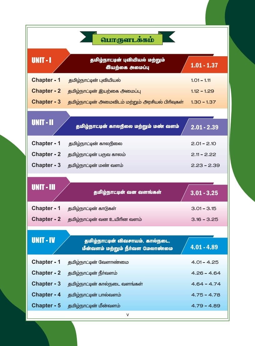 இந்நூலை மொத்தம் 10 அலகுகளாக பிரித்துள்ள இதன் ஆசிரியர், அத்தகு அலகு ஒவ்வொன்றின் கீழும் பல அத்தியாயங்களின் வாயிலாக தமிழ்நாட்டின் புவியியலை எளிய தமிழில் தெளிவுற படம் பிடித்துக் காட்டுகின்றார். வெகு நேர்த்தியாக வரிசைப்படுத்தப்பட்டுள்ள அந்த 10 அலகுகளும் அத்தியாயங்களும் பின்வருமாறு:-